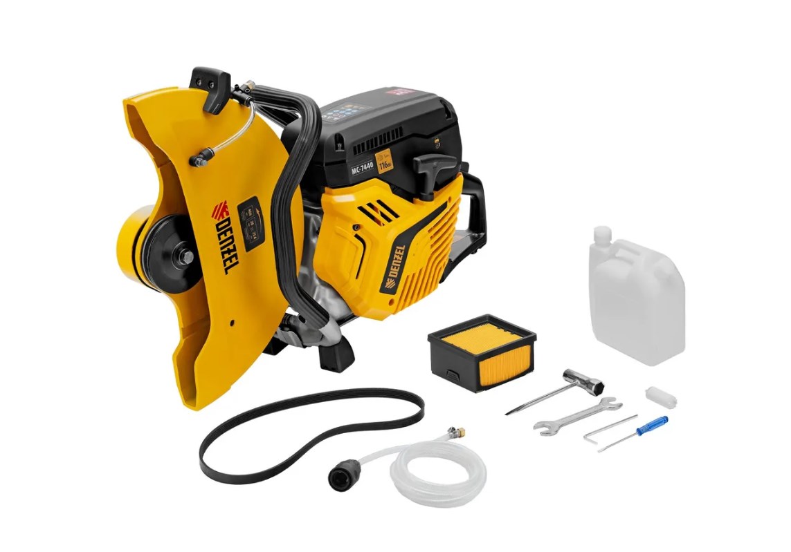 Бензорез Denzel MC-7440 66302 предназначен для работы с бетоном, асфальтом, чугуном, алюминием, сталью и другими твердыми материалами, а также с пластиком. Оптимален для проведения демонтажных работ на строительной площадке, также может применяться во время спасательных операций. Для работы используются алмазные, абразивные и зубчатые диски диаметром 400 мм. Эффективное решение поставленных задач обеспечивает двигатель объемом 74 см3 и мощностью 4,8 л.с., для удобного выбора режущего диска имеется два посадочных диаметра: 20 и 25,4 мм.