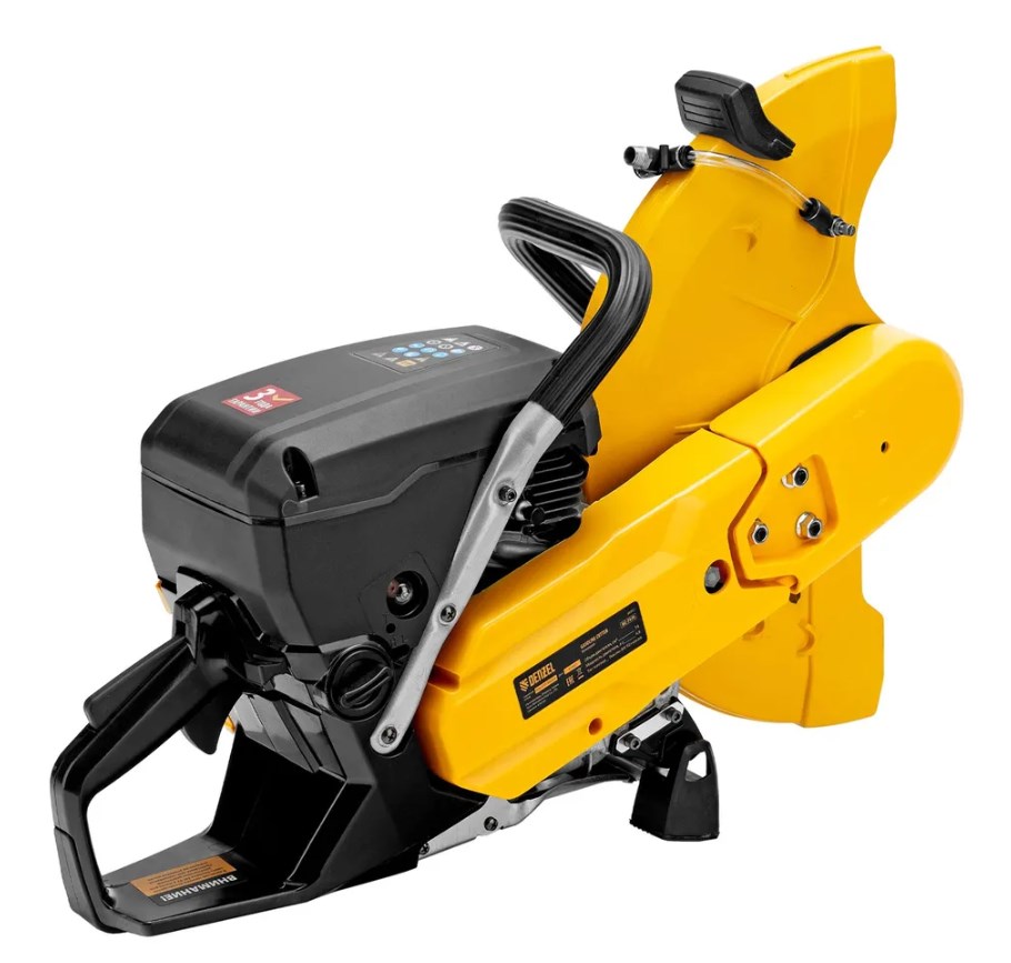 - Безопасность — режущий диск закрыт защитным кожухом, блокиратор курка газа исключает случайный запуск двигателя.
