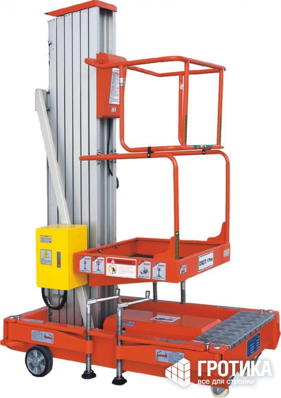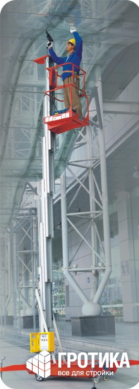 Привод подъемного механизма, установленный на телескопическом подъемнике, может быть как постоянного (питание от аккумуляторной батареи), так и переменного тока (сеть 220 В, 50 Гц). Этот гидравлический подъемник отличает плавность хода и надежная фиксация на заданной высоте (за счет комбинированного использования электропривода, гидравлической и механической систем подъема-опускания).
