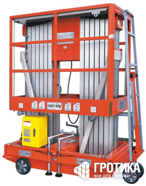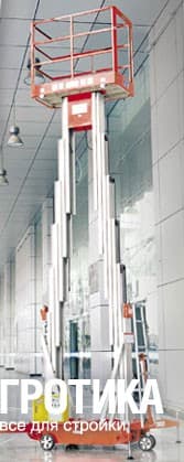 Привод подъемного механизма, установленный на телескопическом подъемнике, может быть как постоянного (питание от аккумуляторной батареи), так и переменного тока (сеть 220 В, 50 Гц). Этот гидравлический подъемник отличает плавность хода и надежная фиксация на заданной высоте (за счет комбинированного использования электропривода, гидравлической и механической систем подъема-опускания).