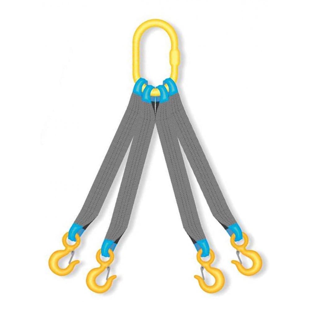 Четырехветвевой текстильный строп изготавливается из синтетического ленточного материала (полиэстер, полипропилен). Устойчив к воздействию окружающей среды, им можно работать в широком диапазоне температур. Обладает небольшим весом, гибкостью, легко принимает заданное положение.
