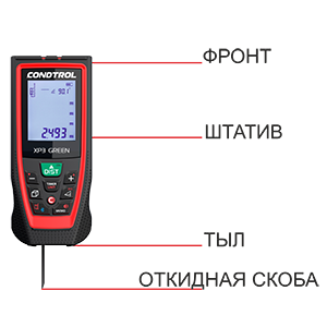 Расстояние может измеряться от передней или задней кромки корпуса дальномера, от точки крепления прибора к штативу и с конца откидной скобы, которая позволяет проводить замеры от внутренних щелей, углов или краев.