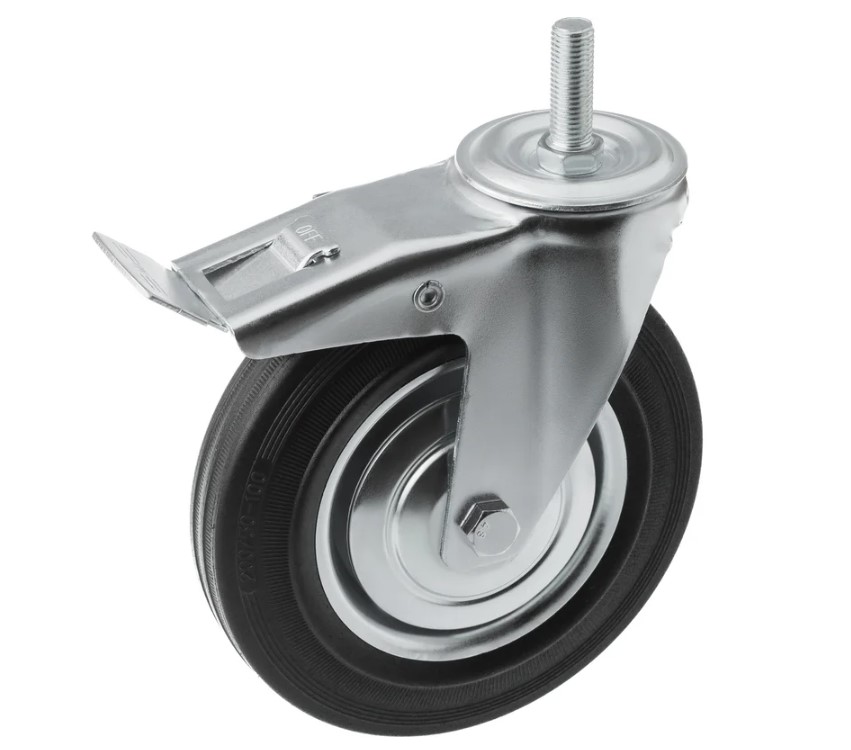 Кронштейн прессованный из листовой оцинкованной стали, упорно-радиальный шарикоподшипник в поворотном узле, ось колеса на болте. Тормозной механизм, установленный на кронштейнах, блокирует поворотный узел и одновременно фиксирует вращение колеса. Все элементы тормозной системы выполнены из металла. Болтовое крепление М16.