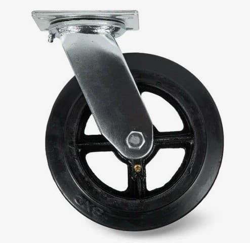Обод колеса произведен из чугуна и покрыт слоем краски. Литая резина увеличивает срок службы большегрузного колеса вдвое.
