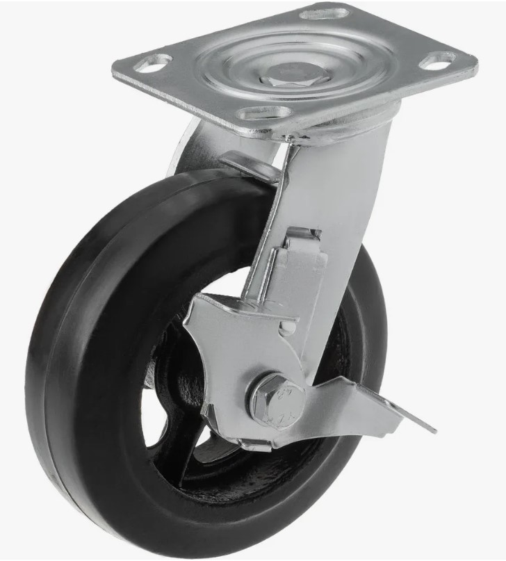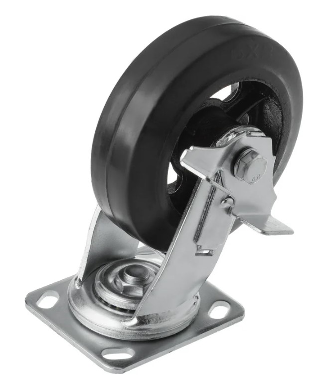 Колесо большегрузное обрезиненное поворотное с тормозом SCdb55 125 мм предназначено для складского оборудования (тачек, тележек) с высокой и обычной грузоподъемностью. Колеса большегрузные широко используется для перемещения грузов во время производства и строительства. Также данный вид колесных опор устанавливается на вышки-туры, и любую другую строительную технику. Колеса большегрузные обрезиненные с платформенным креплением – это колеса для тележек.