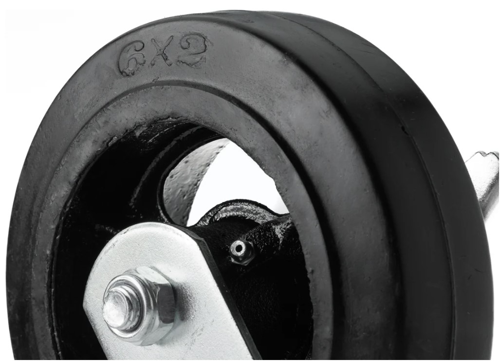 Обод колеса произведен из чугуна и покрыт слоем краски. Литая резина увеличивает срок службы большегрузного колеса вдвое.