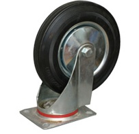 Колесные опоры промышленные поворотные, обод - прессованный из листовой стали, оцинкован, шинка из полуэластичной черной резины, платформенное крепление.