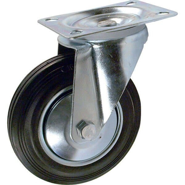 Колесные опоры промышленные поворотные, обод - прессованный из листовой стали, оцинкован, шинка из полуэластичной черной резины, платформенное крепление.