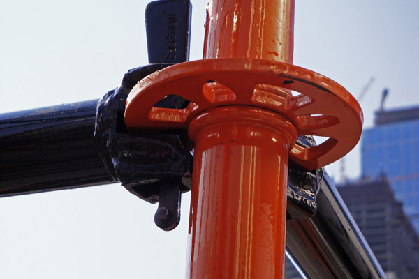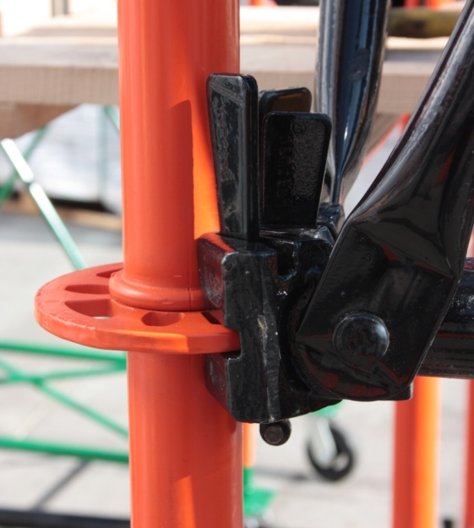 Крепление элементов лесов (связей, поперечин и ограждений) со стойками осуществляется следующим образом: стойки имеют диски с отверстиями, на элементах лесов имеются скоба и упор, с помощью которых обеспечивается центрирование элементов узла крепления между собой. Жесткая фиксация узла осуществляется клином.