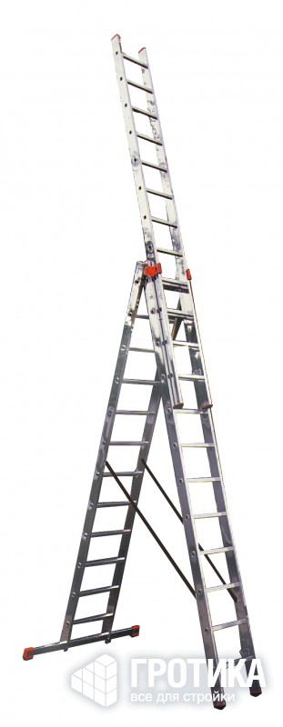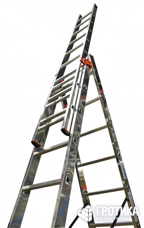 Алюминиевая трехсекционная лестница с перекладинами, универсального применения: может использоваться как приставная и выдвижная лестница или как стремянка