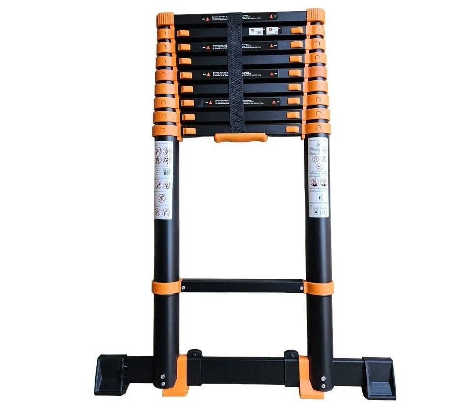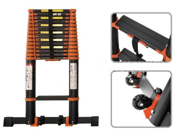 Лестница-стремянка телескопическая МИ ПРОФИ MAX 12 широких ступеней, изготовлена по технологиям из алюминия и снабжена высокопрочными шарнирами (замками) из стали. Отличается ударопрочным покрытием и защитой от коррозии, имеет большие и прочные замки. Она легко транспортируется, без проблем помещается даже в небольшой автомобиль, так как имеет меньшие габариты по сравнению с обычными лестницами. Лестница без усилий быстро раскладывается. В комплекте поставки идёт стабилизатор, на который устанавливаются транспортировочные колёса.