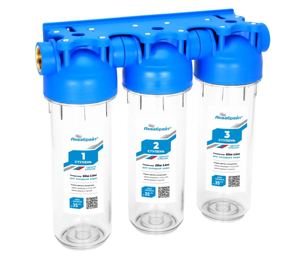 трехступенчатый магистральный фильтр АКВАБРАЙТ стандарт SLIM LINE. Прозрачные корпуса. Рабочее давление от 2 до 6 атм. Подключение ЛАТУННАЯ ВСТАВКА 3/4 дюйма. Кронштейн и ключ в комплекте.