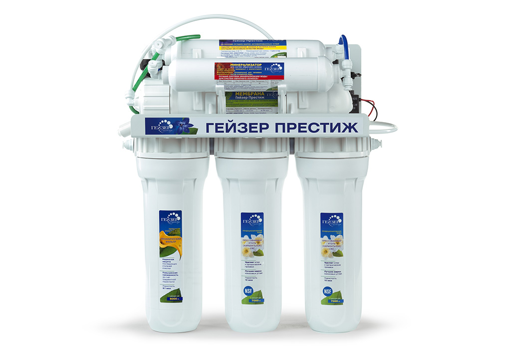 Технология обратного осмоса, использованная в фильтре Гейзер Престиж, заключается в фильтровании воды через полупроницаемую мембрану. Размеры пор мембраны настолько малы, что пропускают только молекулы воды. Размер молекул большинства примесей, а также бактерий и вирусов значительно больше молекул воды, поэтому они не проходят через мембрану. Система работает при давлении в подводящей магистрали не менее 3 атм.