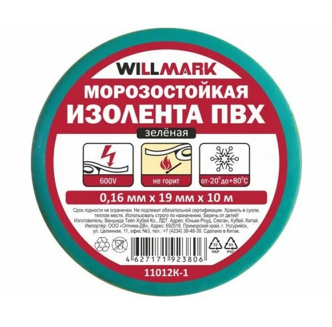 ПВХ-изолента Willmark морозостойкая, зеленая, 0.16 мм, 19 мм, 10 м в Красноярске