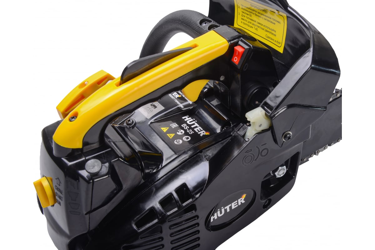 - Надежное удержание. Рукоятка бензопилы Huter BS-25 70/6/5 имеет удобную для захвата форму.