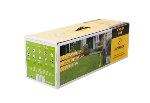 Стандартная глубина бурения 1.2 м. Диаметр скважины — 200 мм. Вес инструмента составляет 2.5 кг.