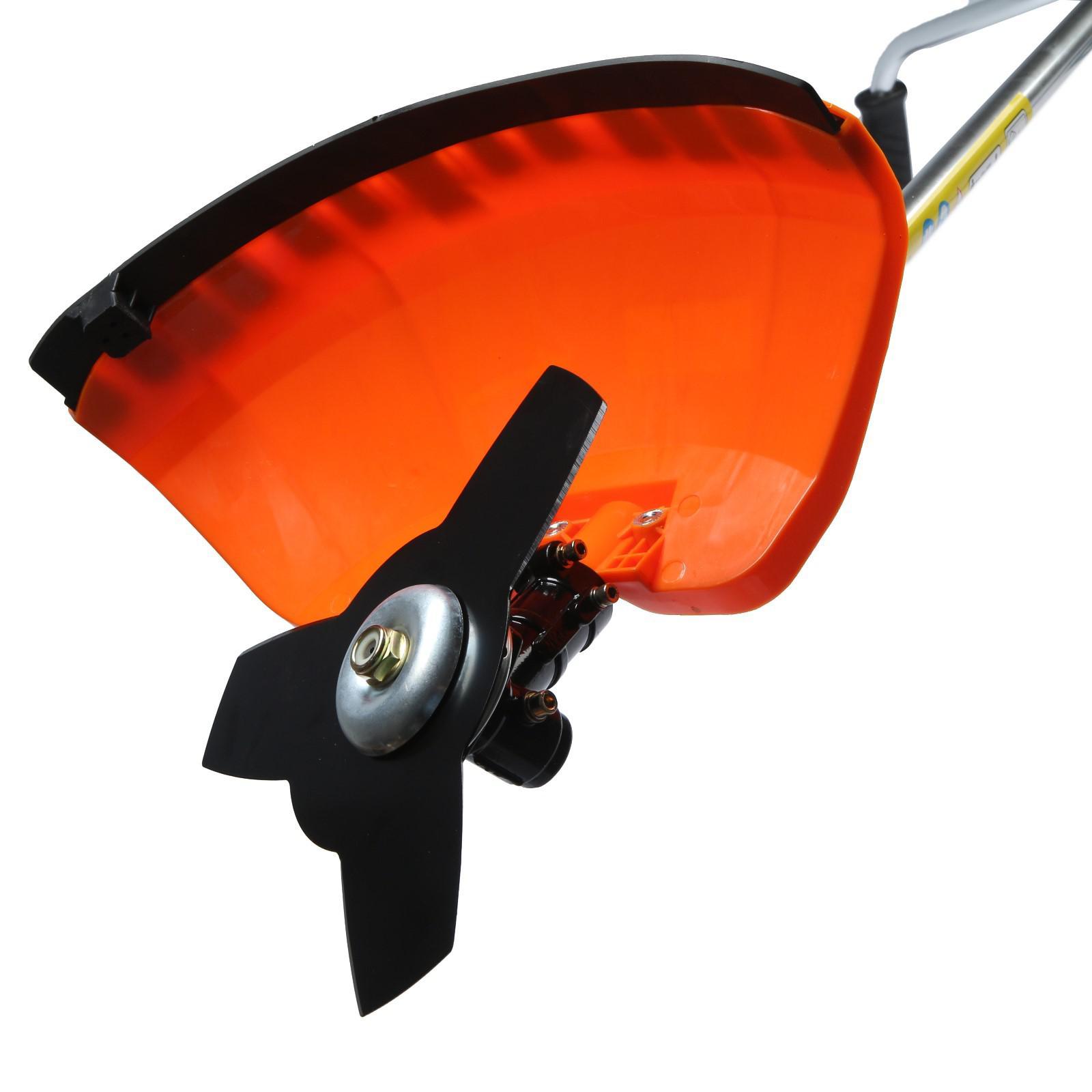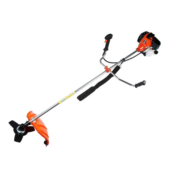 Благодаря хромированному цилиндру двигателя повышен ресурс инструмента. Защитный кожух предотвращает разлетание мусора и травы по сторонам при работе. Простой двухтактный карбюраторный двигатель воздушного охлаждения, надежен и прост в обслуживании. Конструкция корпуса триммера хорошо сбалансирована по весу, рычаг управления газом расположен под правой рукой, в виде классической велосипедной ручки.