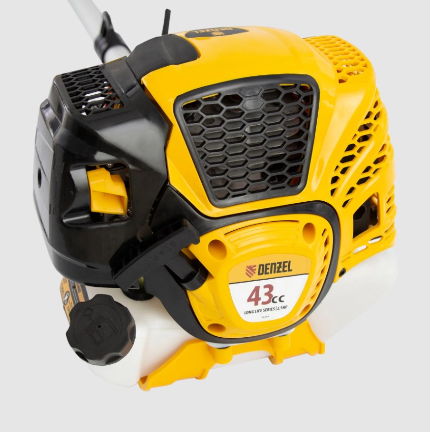 Бензиновый триммер Denzel DTL-43S 96264 с разъемной штангой, состоящей из 2 частей, оснащен 2-тактным двигателем объемом 43 см3 и предназначен для стрижки газона, скашивания травы всех типов, в том числе с жесткими древовидными стеблями (полыни, крапивы, лебеды, борщевика), а также срезания кустарника и молодых побегов деревьев с диаметром стволов до 10 мм.