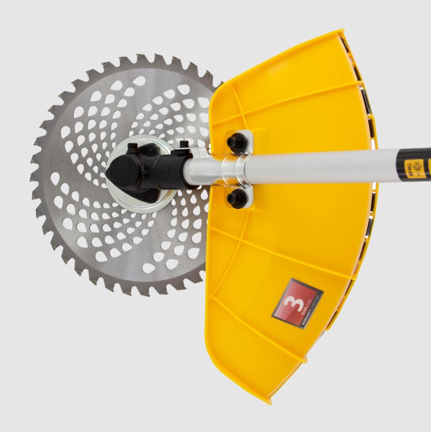 - Дополнительные возможности — можно приобрести и установить на триммер диски Denzel 96323, 96325 для быстрого удаления растительности с жесткими стеблями (полыни, крапивы, лебеды), 96328 для скашивания молодых побегов кустарника диаметром до 3 мм.