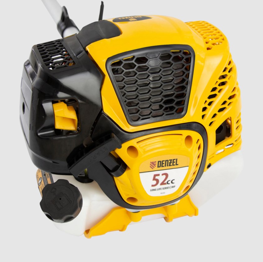 Бензиновый триммер Denzel DTL-52S 96266 с разъемной штангой, состоящей из 2 частей, оснащен 2-тактным двигателем объемом 52 см3 и предназначен для стрижки газона, скашивания травы всех типов, в том числе с жесткими древовидными стеблями (полыни, крапивы, лебеды, борщевика), а также срезания кустарника и молодых побегов деревьев с диаметром стволов до 10 мм. Усиленная катушка с леской и пильный диск обеспечивают ширину скашивания 42 и 25,5 см. Инструмент не требует подключения к электросети, поэтому подходит для работы с влажной травой и может использоваться на отдаленных от дома участках.