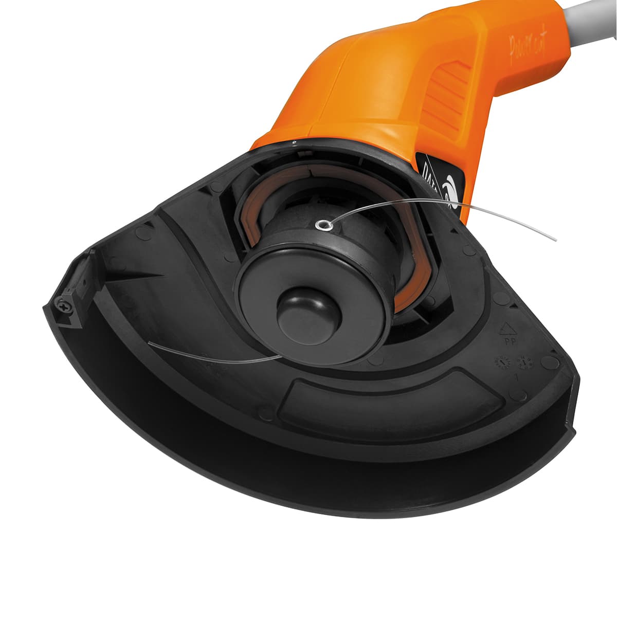 Телескопическая рукоятка позволяет менять длину косы под рост оператора. Защитный кожух из ударопрочного пластика надежно защищает оператора от получения травм в случае попадания в режущий механизм твердых предметов.