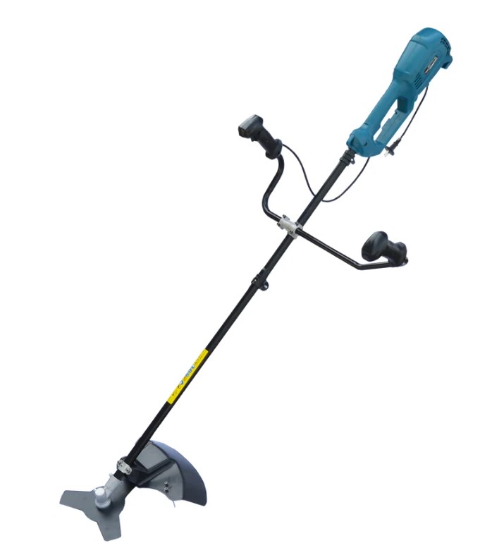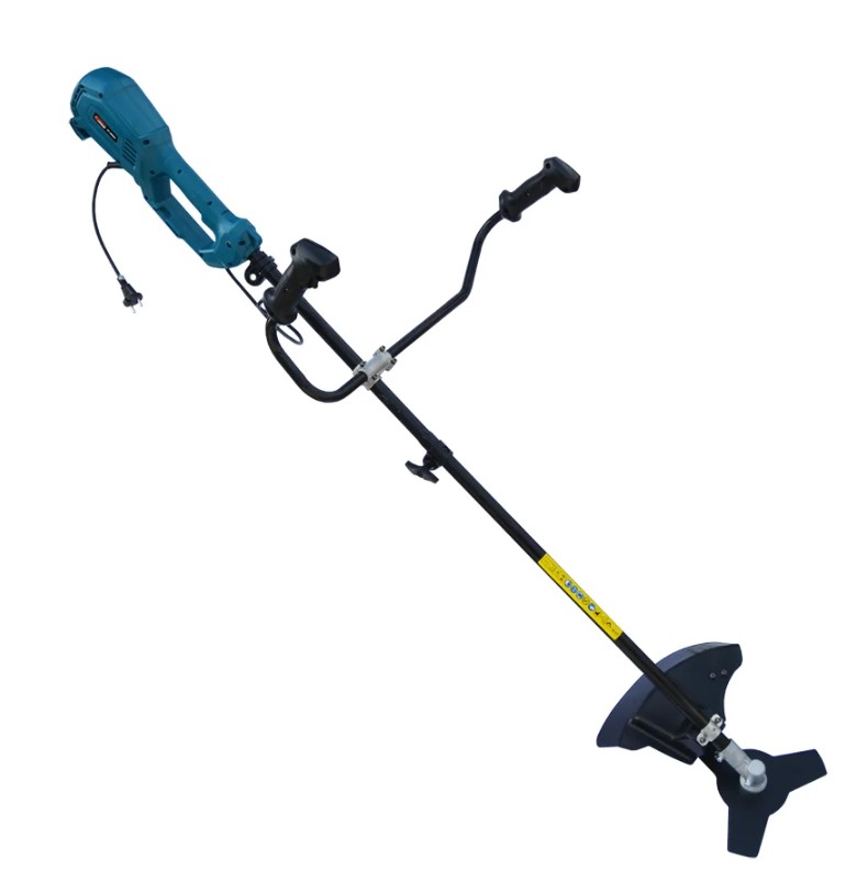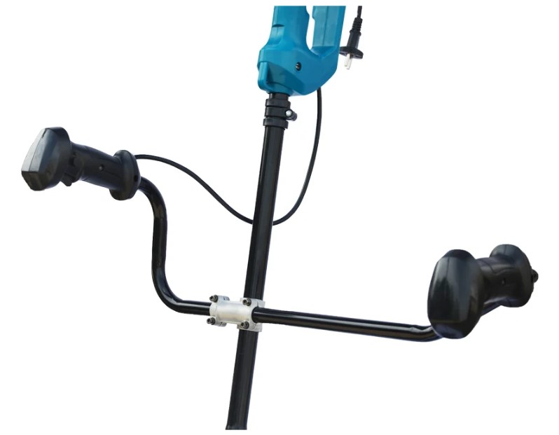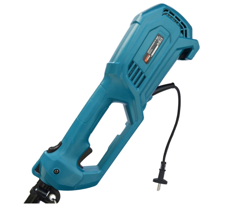 Электротриммер с ножом и леской имеет наплечный ремень для снижения нагрузки на оператора, защитный кожух режущего основания и разъемную штангу, что упрощает транспортировку инструмента и его хранение. Мощность электрокосы позволяет справляться с мелкой и средней растительностью, стричь газоны и удалять сорняки. Садовый триммер работает ножом с тремя лезвиями или леской, диаметром до 4 мм.