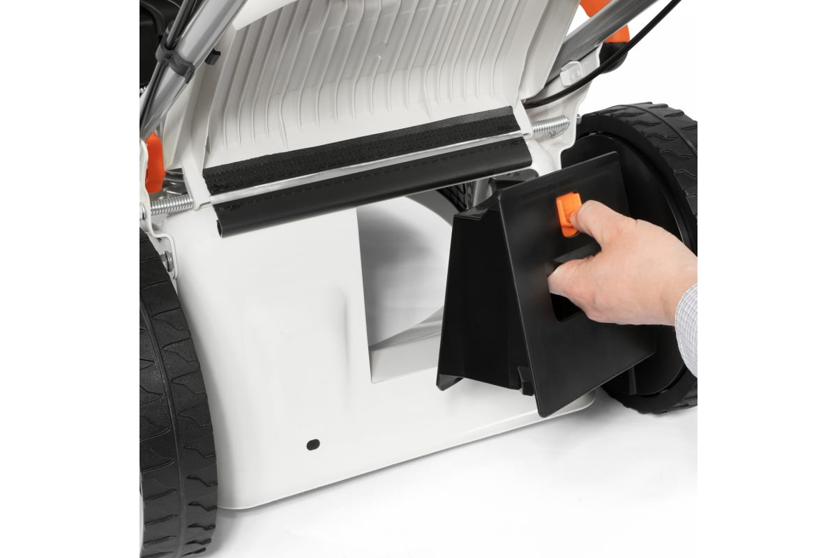 Современная конструкция двигателя и складная рукоятка позволяют компактно хранить газонокосилку в вертикальном положении.