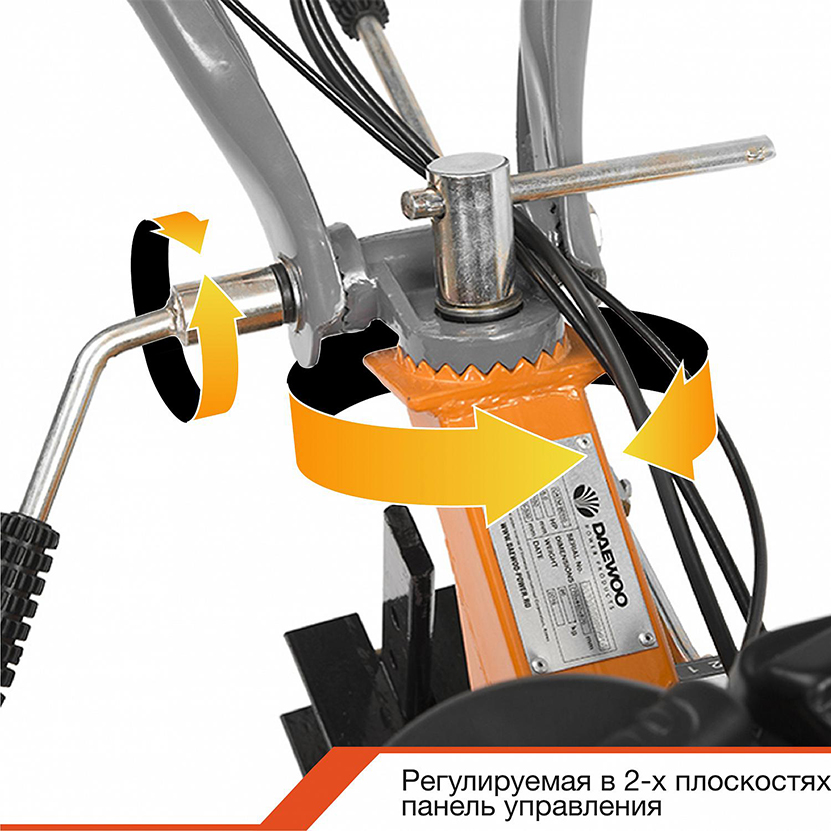 Регулируемая панель управления в 2-х плоскостях имеет возможность как регулировки по высоте, так и горизонтали, относительно мотоблока. Облегченная система изменения высоты является запатентованной разработкой Daewoo, будучи самой удобной и надежной в своем классе.
