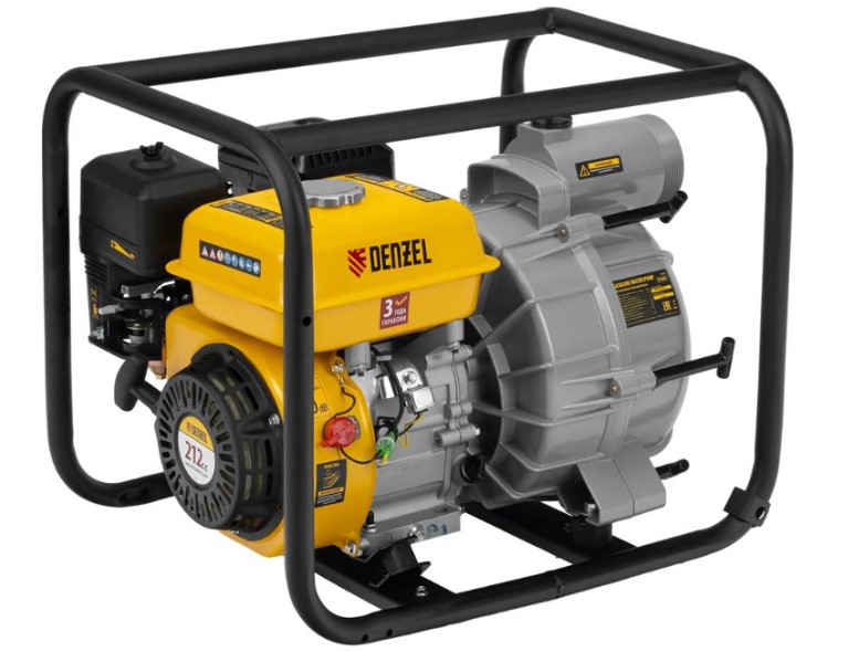 Бензиновая мотопомпа Denzel PX-80D7 99206 с двигателем мощностью 7 л. с. и штуцерами диаметром 3" обеспечивает напор 30 м и применяется для откачки грязной воды со скоростью 1300 л/мин из затопленных помещений, а также бассейнов, котлованов, траншей, погребов, колодцев глубиной до 8 м.
