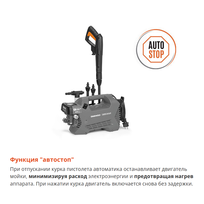 Функция «Автостоп» при отпускании курка пистолета автоматика останавливает двигатель мойки, минимизируя расход электроэнергии и предотвращая нагрев аппарата. При нажатии курка двигатель включается снова без задержки.