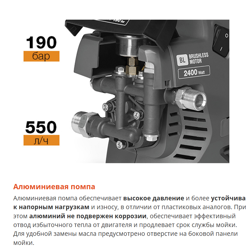 Алюминиевая помпа обеспечивает высокое давление и более устойчива к напорным нагрузкам и износу, в отличие от пластиковых аналогов. При этом алюминий не подвержен коррозии, обеспечивает эффективный отвод избыточного тепла от двигателя и продлевает срок службы мойки. Для удобной замены масла предусмотрено отверстие на боковой панели мойки.