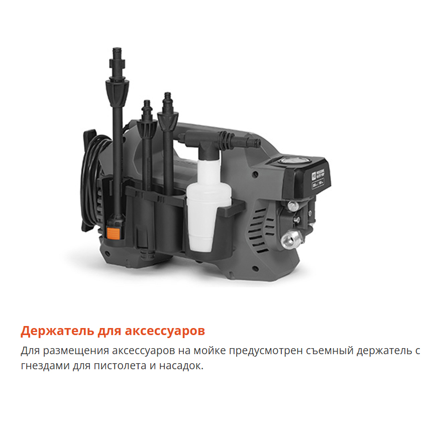 Держатель для аксессуаров для размещения аксессуаров на мойке предусмотрен съемный держатель с гнездами для пистолета и насадок.