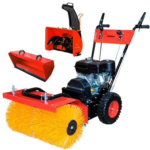 В комплекте 2 насадки: снегоуборочная и подметальнаяа. Двигатель: 1-цилиндровый, 4-ч тактный с воздушным охлаждением