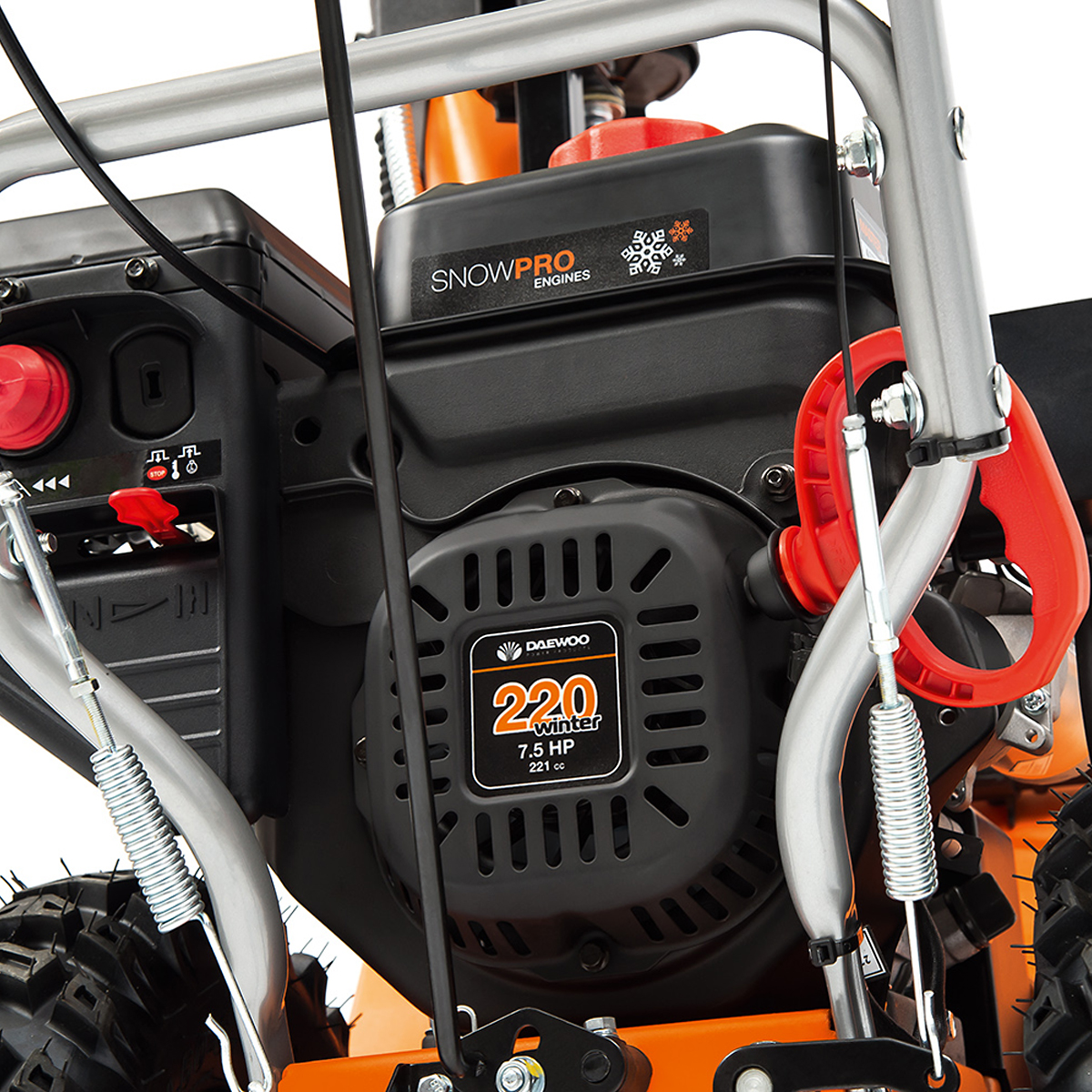 Особенности снегоуборщика DAEWOO: система привода Disk-O-Matik; проходимость и маневренность; электрический стартер; яркая LED фара; агрессивные шнеки-ледорубы с легкостью справятся с любым, даже слежавшимся и обледенелым снегом; самовосстанавливающийся редуктор; большие зимние пневматические колеса с протектором специальной формы X-TRACK обеспечивают наилучшее сцепление с зимней и обледенелой поверхностью, увеличенный диаметр и ширина колес гарантируют отличную проходимость даже при высоком снежном покрове; панель управления с системой изменения скорости передвижения и дальности выброса снега; стальной желоб выброса снега; датчик уровня масла; защита от ржавчины ZN+; направляющие лыжи позволяют регулировать высоту ковша над поверхностью, в зависимости от высоты снежного покрова и типа убираемой поверхности, тем самым, избегая ее повреждение; расширители ковша в комплекте, крепятся к ковшу с двух сторон, благодаря чему увеличивается ширина обработки и производительность уборки снега. Габариты (Д*Ш*В) 765х650х630 мм