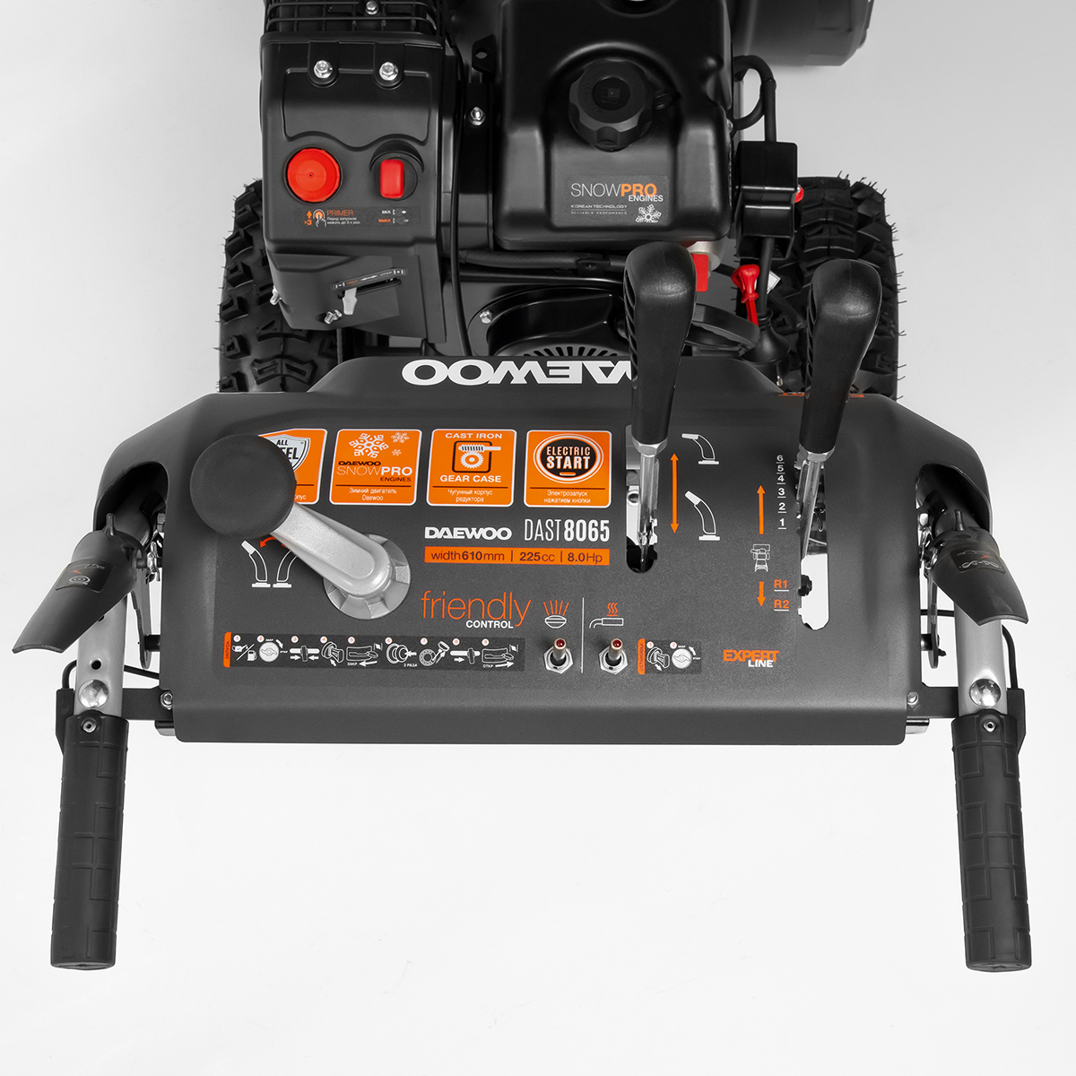 Особенности снегоуборщика DAEWOO: электрический стартер, яркая LED фара, подогрев рукояток, система привода Disk-O-Matik, шнеки и крыльчатка выброса снега, проходимость и маневренность, агрессивные шнеки-ледорубы, самовосстанавливающийся редуктор, большие зимние пневматические колеса, панель управления, стальной желоб выброса снега, датчик уровня масла, защита от ржавчины ZN+, двухсоставные направляющие лыжи. Габариты (Д*Ш*В) 1150x710x640 мм.