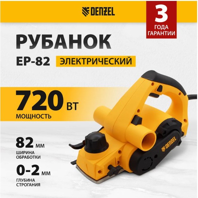 Электрический рубанок Denzel EP-82 27801 мощностью 720 Вт обеспечивает ширину обработки 82 мм и предназначен для строгания плоских деревянных поверхностей, снятия фасок, выборки четверти. Частота вращения барабана составляет 16000 об/мин, выборка четверти производится на глубину до 18 мм, что позволяет эффективно решать поставленные задачи. Инструмент подходит для бытового использования.