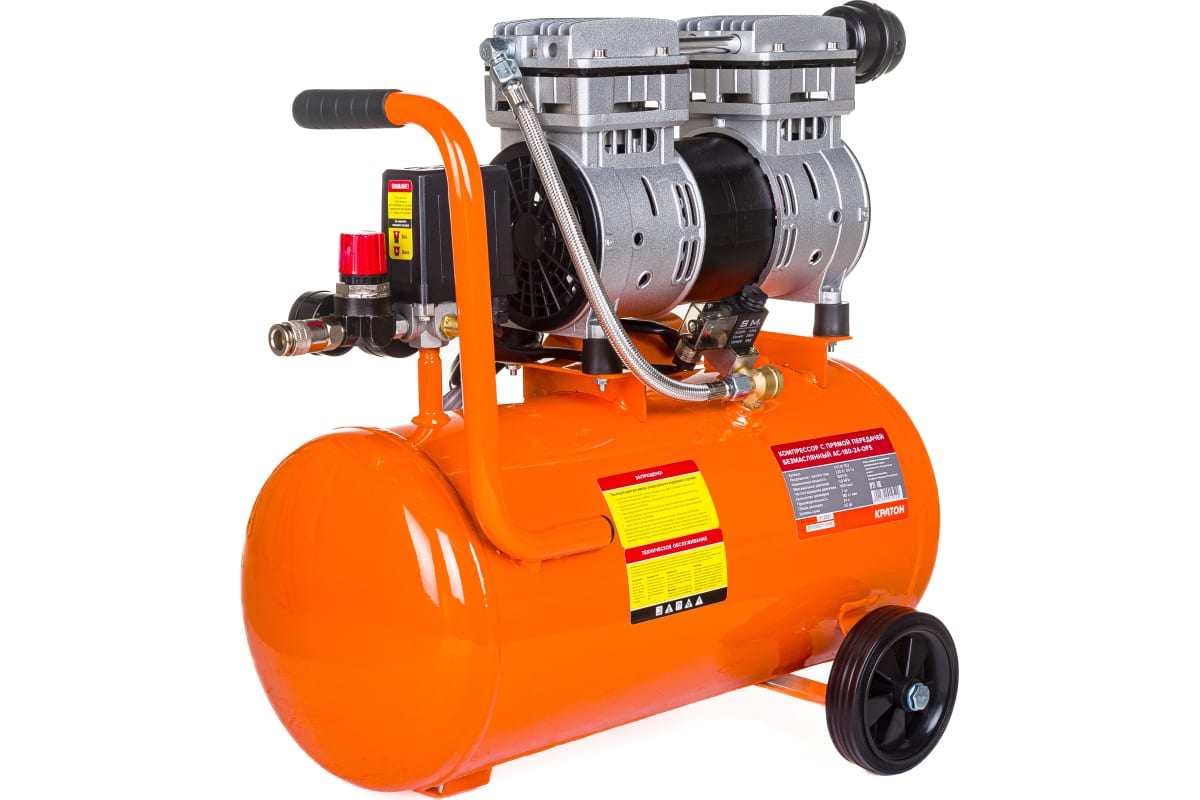 Безмасляный компрессор с прямой передачей Кратон AC-180-24-OFS 3 01 01 052 предназначается для сжатия и нагнетания атмосферного воздуха в пневмооборудование. Модель широко используется для накачки шин, а также во время покрасочных работ. Большие колеса и рукоятка эргономичной формы позволяют с удобством перемещать устройство на небольшие расстояния. Клапанные пластины выполнены из пружинной стали, которая отличается прочностью и долговечностью. Резиновая опора обеспечивает устойчивость конструкции, а также способствуют равномерному распределению вибраций. В днище ресивера располагается сливной клапан, который служит для быстрого удаления накопившегося конденсата.