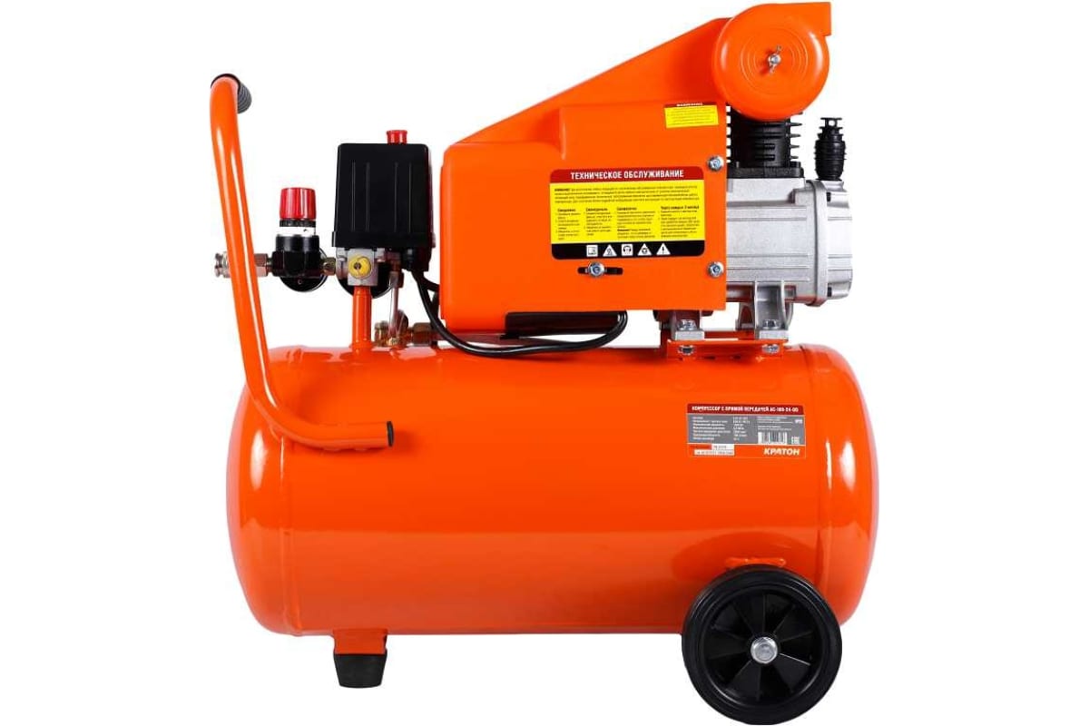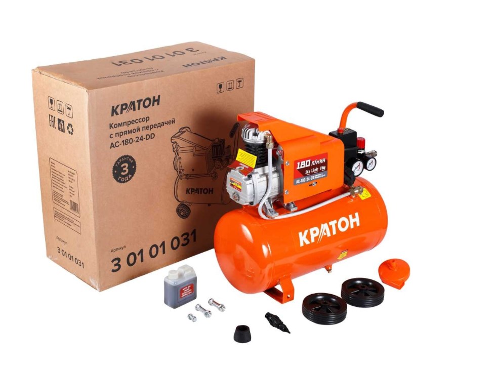 - Простая и удобная транспортировка. Два больших колеса делают транспортировку компрессора с прямой передачей Кратон AC-180-24-DD 3 01 01 031 простой и удобной.