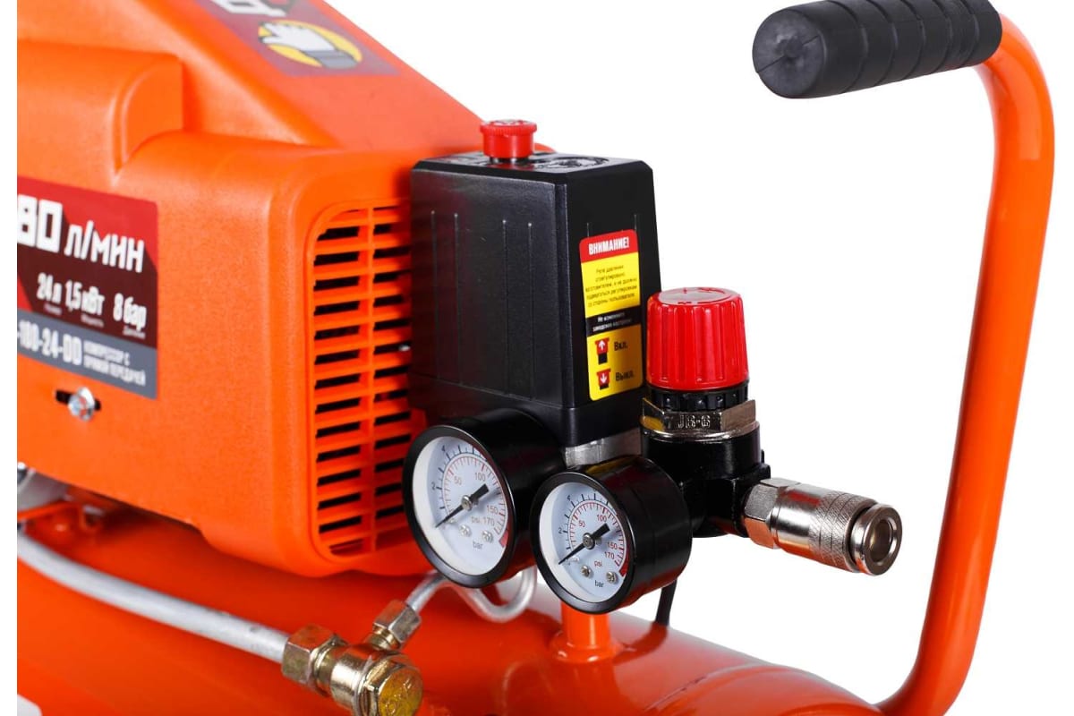 - Регулятор давления позволяет настроить работу компрессора под оптимальный режим с пневмоинструментом;