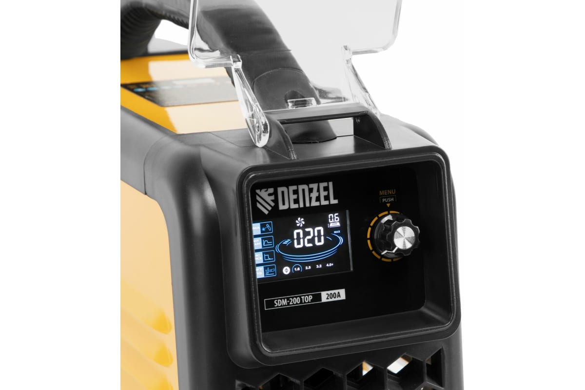 Основное достоинство линейки Denzel SDM — синергетическое управление, значительно облегчающее подбор оптимальных параметров сварки. Аппарат дает возможность указать толщину свариваемого металла, после чего автоматически подбирает оптимальный сварочный ток и диаметр электрода. И наоборот: достаточно установить требуемое значение сварочного тока и на дисплее отобразится минимальная рекомендованная толщина свариваемых деталей, а также диаметр электрода. Аппарат эффективно работает даже при нестабильном напряжении, предназначен для использования в профессиональной сфере и в быту.