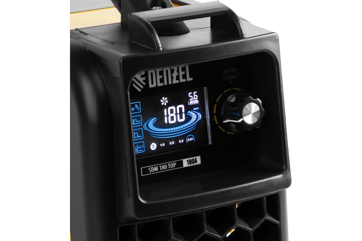 Основное достоинство линейки Denzel SDM — синергетическое управление, значительно облегчающее подбор оптимальных параметров сварки. Аппарат дает возможность указать толщину свариваемого металла, после чего автоматически подбирает оптимальный сварочный ток и диаметр электрода. И наоборот: достаточно установить требуемое значение сварочного тока и на дисплее отобразится минимальная рекомендованная толщина свариваемых деталей, а также диаметр электрода. Аппарат эффективно работает даже при нестабильном напряжении, предназначен для использования в профессиональной сфере и в быту.