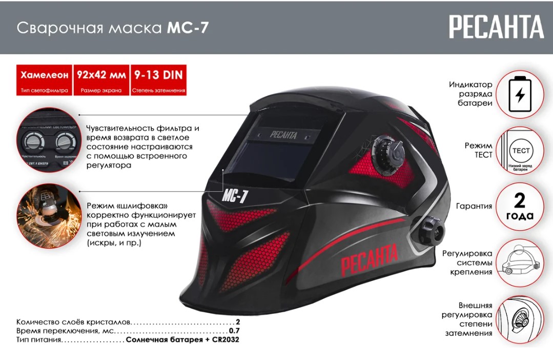 Кроме основного сварочного режима, в модели Ресанта МС-7 реализованы режимы: «Шлифовка» для работы шлифовальными машинами и «TEST» для проверки работоспособности маски перед началом работы. Модель получила эластичную накладку в затылочной части, препятствующую скольжению, удобную регулировку оголовья, и увеличенный «подбородок», обеспечивающий надёжную защиту воротниковой зоны. Питание маски может осуществляться от солнечной батареи или от элемента CR2032 на 3В с возможностью быстрой замены.