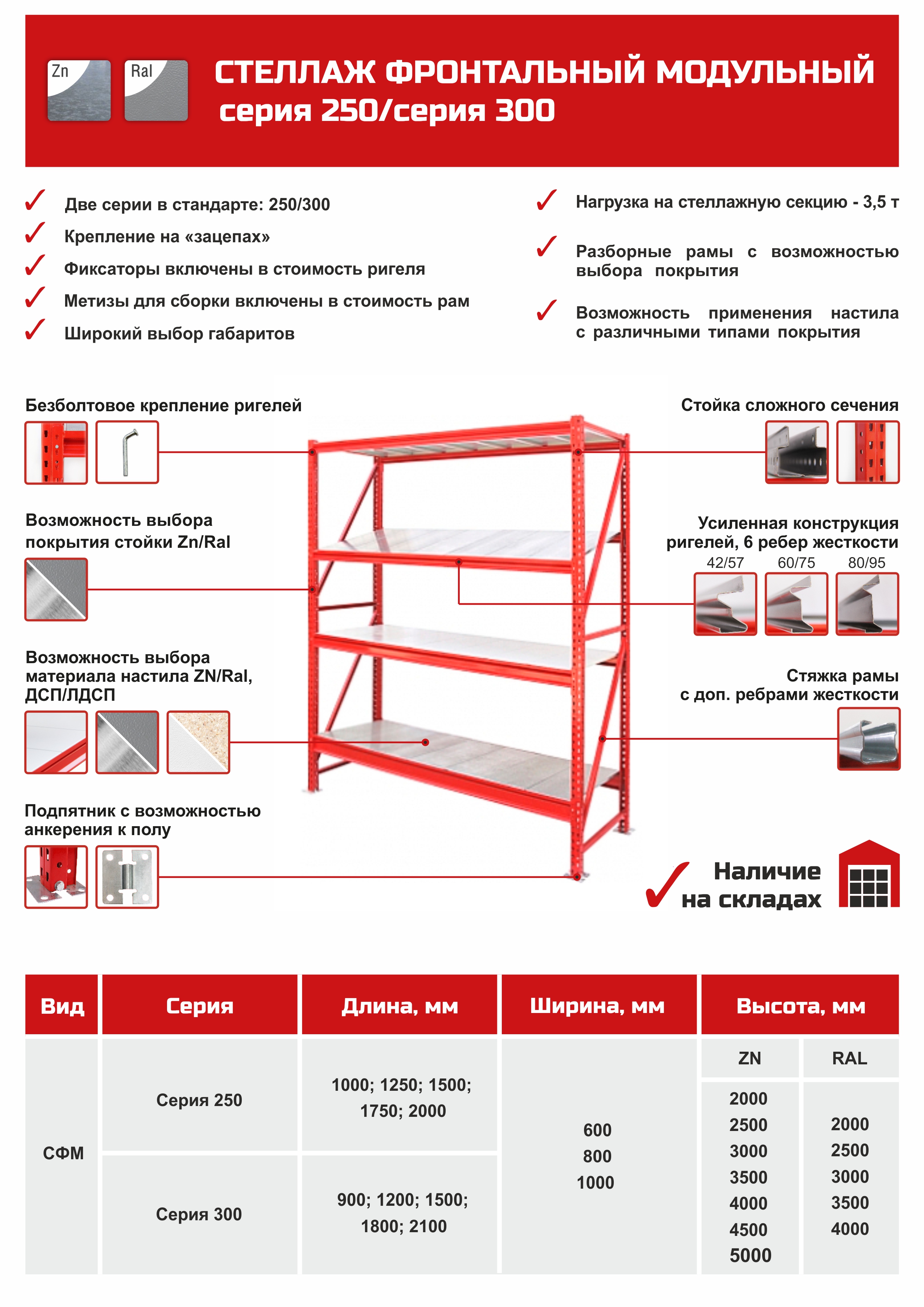 усиленная конструкция ригелей - 6 ребер жесткости; настил укладывается на ригеля без дополнительного крепления; возможность присоединения дополнительной секции стеллажа через общую стойку благодаря двум рядам перфорации; простой в сборке, удобный в эксплуатации; для сборки не требуются специальные инструменты; особая конструкция стеллажа позволяет в любой момент менять расположение уровней хранения, не разбирая весь стеллаж и не используя инструменты; наращивая секции по бокам, можно создать любую комбинацию стеллажей; метизы для сборки включены в стоимость рам; подпятник с возможностью анкерения к полу; стеллажи серии СФМ могут комплектоваться тремя видами ригелей: лёгкими, средними и тяжёлыми. От вида ригелей будет зависеть максимальная нагрузка на уровень; стеллажи СФМ можно собрать со следующими вариантами по ширине: 900, 1000, 1200, 1250, 1500, 1750, 1800, 2000 и 2100 мм. металлические секции настила СФМ выпускаются в двух вариантах исполнения: обычные и наружные. Наружные секции настила дополнительно стягивают ригели, поэтому подходят для установки на широких стеллажах, либо если предполагаются большие нагрузки на полку. По умолчанию стеллажи СФМ, представленные на нашем сайте, комплектуются обычными секциями настила. помимо металлических секций настила, стеллажи СФМ могут комплектоваться настилом из ДСП либо ЛДСП толщиной 16 мм.