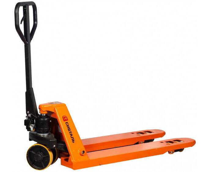 Тележка ручная гидравлическая представляет собой устройство, состоящее из вилочной металлической конструкции, оснащенной колесами для ее перемещения, ручки управления процессом подъема и перемещения, гидравлического узла. Вилы тележки изготовлены из листовой стали методом штамповки.