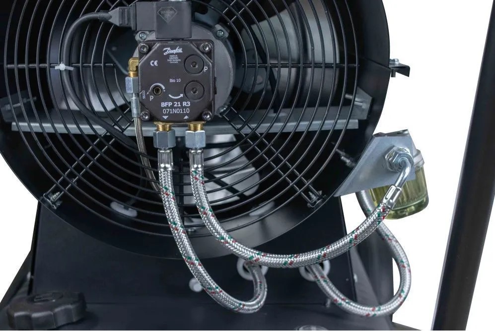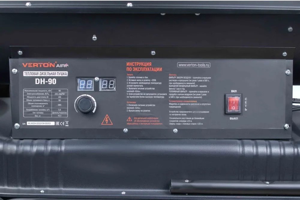 Система управления оснащена термостатом, который позволяет поддерживать установленную температуру в обогреваемом помещении и цифровым дисплеем, адаптированным к работе при отрицательных температурах, что делает управление пушкой более простым, удобным, и комфортным;