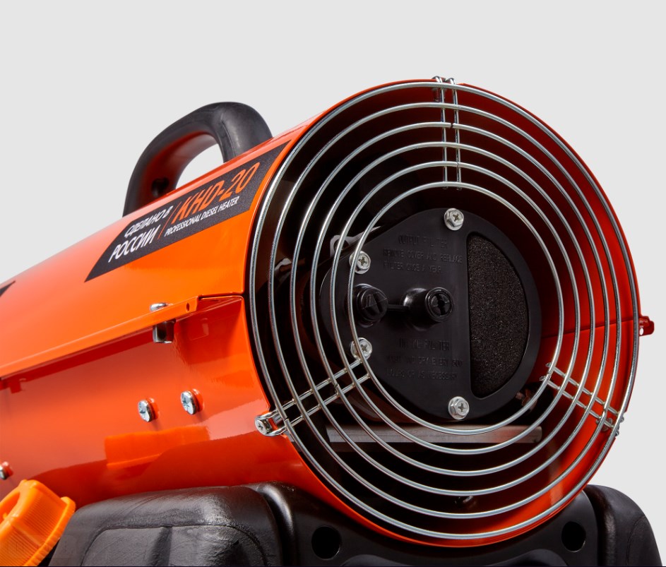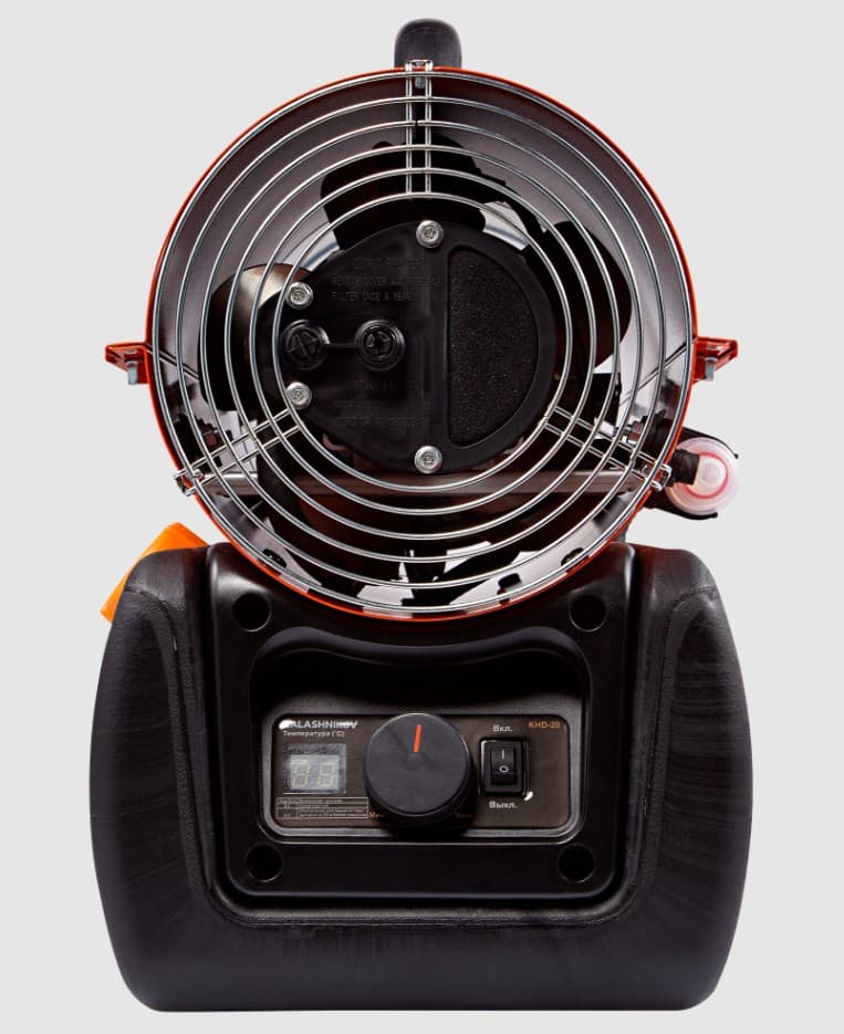 автоматически поддерживая заданную для работы температуру. Безопасность использования дизельной тепловой пушки KALASHNIKOV KHD-20 обеспечивает электронная плата управления при помощи температурного датчика и фотоэлемента,