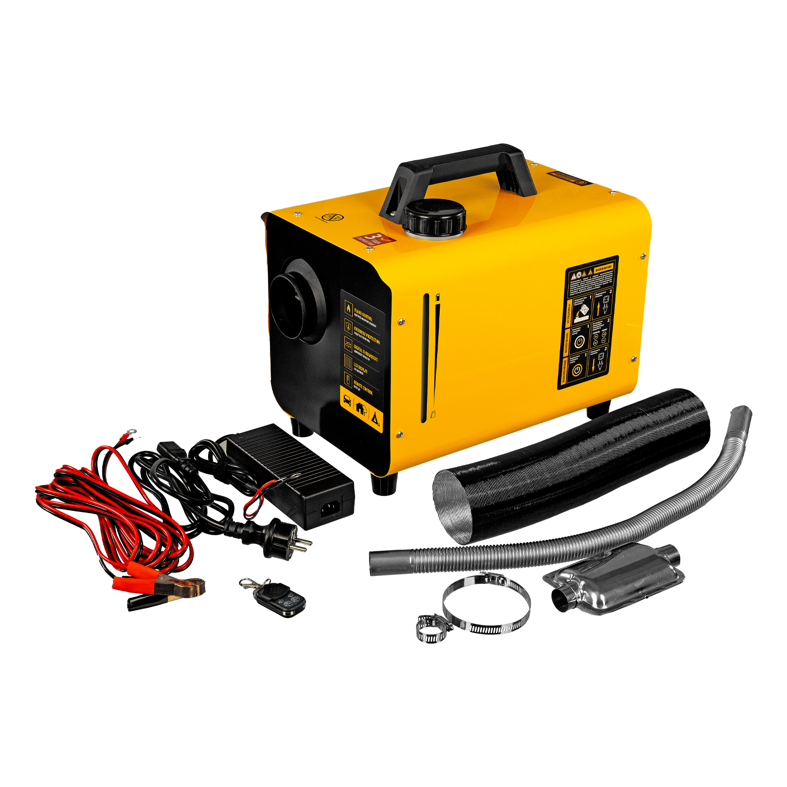 Полная комплектация — к пушке прилагаются гофротруба и труба для отвода выхлопных газов, кабель питания от аккумулятора с клеммами 5 м, блок питания от сети 230 В (длина шнура 3 м), хомуты и глушитель.