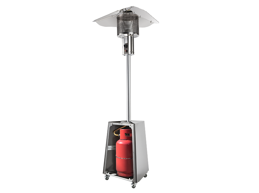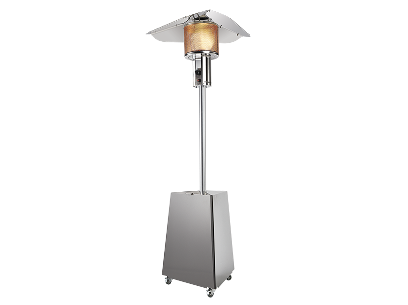 Уличный газовый инфракрасный обогреватель состоит их двух частей: нижняя имеет форму трехгранной усеченной пирамиды, выполнена из металлического каркаса, на который крепятся декоративные панели, верхняя представляет собой несущий стержень, в верхней части которого выполнена цилиндрическая горелка и отражатель.