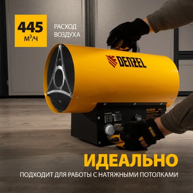 Газовая тепловая пушка Denzel GHG-30i 96471 мощностью 30 кВт, с цифровым термостатом и двойным электромагнитным клапаном, работает на сжиженном газе пропан-бутан и предназначена для обогрева хорошо вентилируемых нежилых помещений площадью до 300 кв. м: складов, цехов, гаражей, мастерских, теплиц.