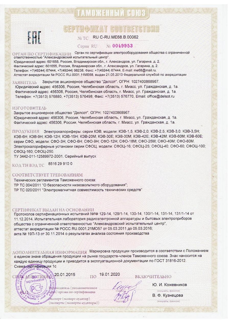 Калорифер для защиты от перегрева снабжен термовыключателями.